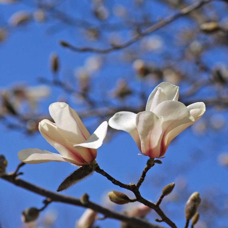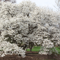Blooms in the spring, before growing leaves, with large, fragrant, white flowers.